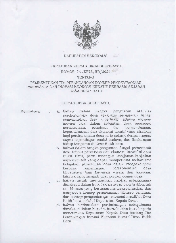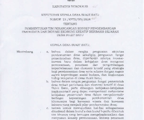 PEMBENTUKAN TIM PERANCANGAN KONSEP PENGEMBANGAN PARIWISATA DAN INOVASI EKONOMI KREATIF BERBASIS SEJARAH DESA BUKIT BATU