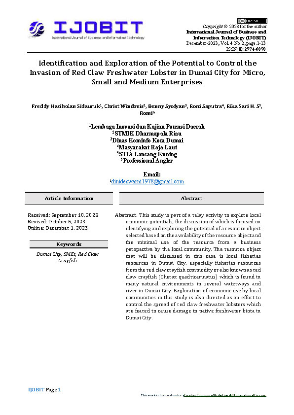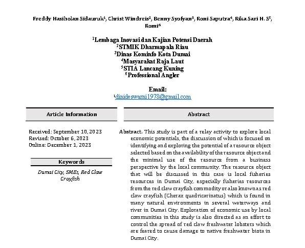 IDENTIFICATION AND EXPLORATION OF THE POTENTIAL TO CONTROL THE INVASION OF RED CLAW FRESHWATER LOBSTER IN DUMAI CITY FOR MICRO, SMALL AND MEDIUM ENTERPRISES