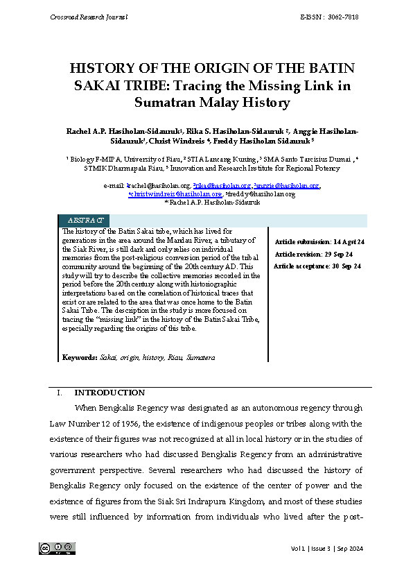 HISTORY OF THE ORIGIN OF THE BATIN SAKAI TRIBE: TRACING THE MISSING LINK IN SUMATRAN MALAY HISTORY