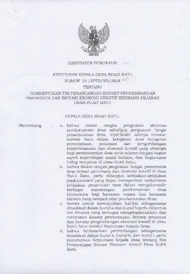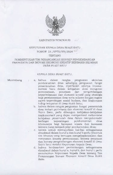 TENTANG PEMBENTUKAN TIM PERANCANGAN KONSEP PENGEMBANGAN PARIWISATA DAN INOVASI EKONOMI KREATIF BERBASIS SEJARAH DESA BUKIT BATU