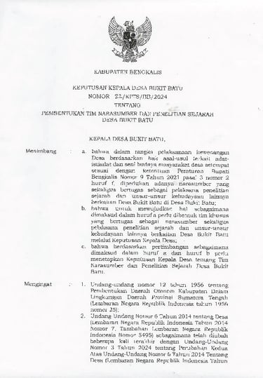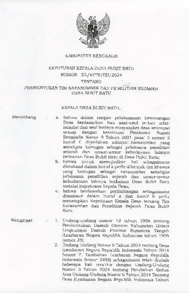 bahwa untuk mewujudkan hal sebagaimana dimaksud dalam huruf a perlu dibentuk tim khusus yang bertugas sebagai narasumber sekaligus pelaksana penelitian sejarah dan unsur-unsur kebudayaan lainnya berkaitan Desa Bukit Batu melalui Keputusan Kepala Desa;